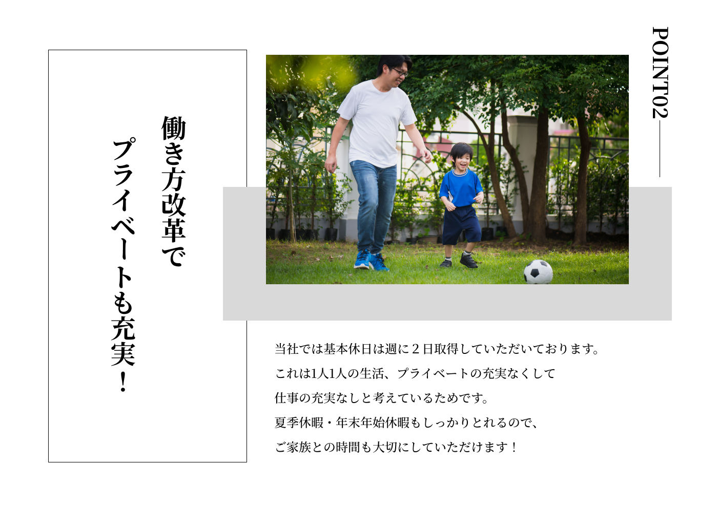 一週間のうちいずれか2日間休日、夏季休暇・年末年始休暇があります。