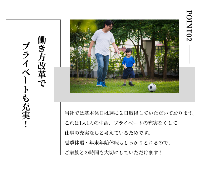 一週間のうちいずれか2日間休日 夏季休暇・年末年始休暇 ※ 従事する担当業務により変動あり) |