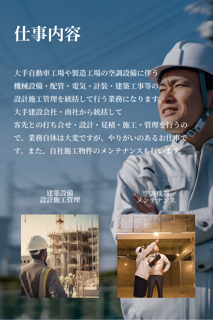 ・大手プラント設備での空調設備に伴う機械設備 ・配管、電気、計装、建築工事等の設計施工管理を統括して行う業務 ・空調設備の点検、改造 |